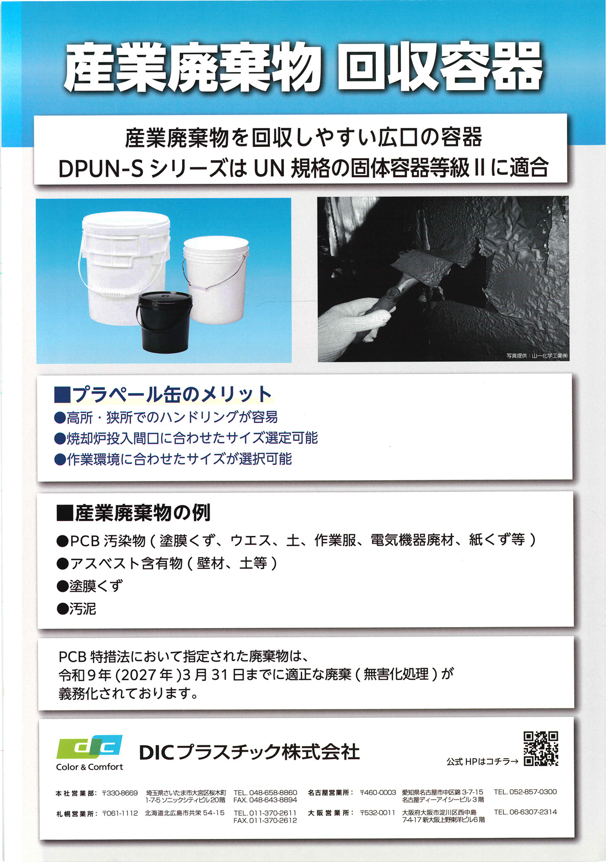 PCB汚染物、アスベスト含有物、塗膜くず、汚泥などの産業廃棄物を回収しやすい広口のプラペール缶です。