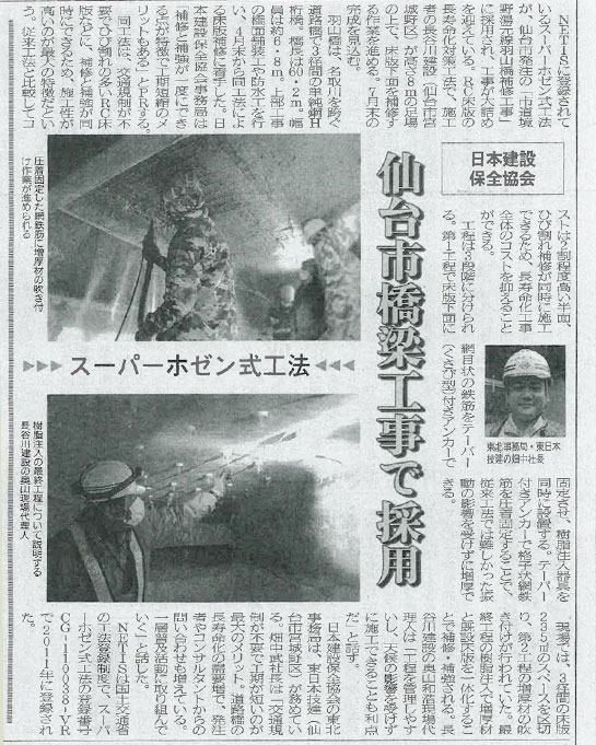 NETISに登録されているスーパーホゼン式工法による「市道堺野湯元線羽山橋補修工事」についての記事が 日刊建設新聞(宮城全県版)に掲載されました。