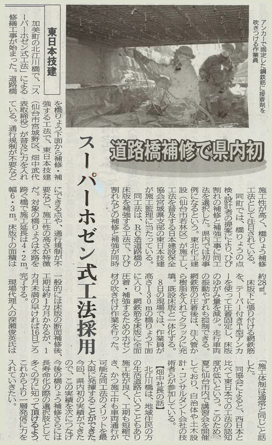 当社が施工管理を担当した「スーパーホゼン式工法」による加美町 北江川橋での補修工事についての記事が 日刊建設新聞(宮城全県版)に掲載されました。